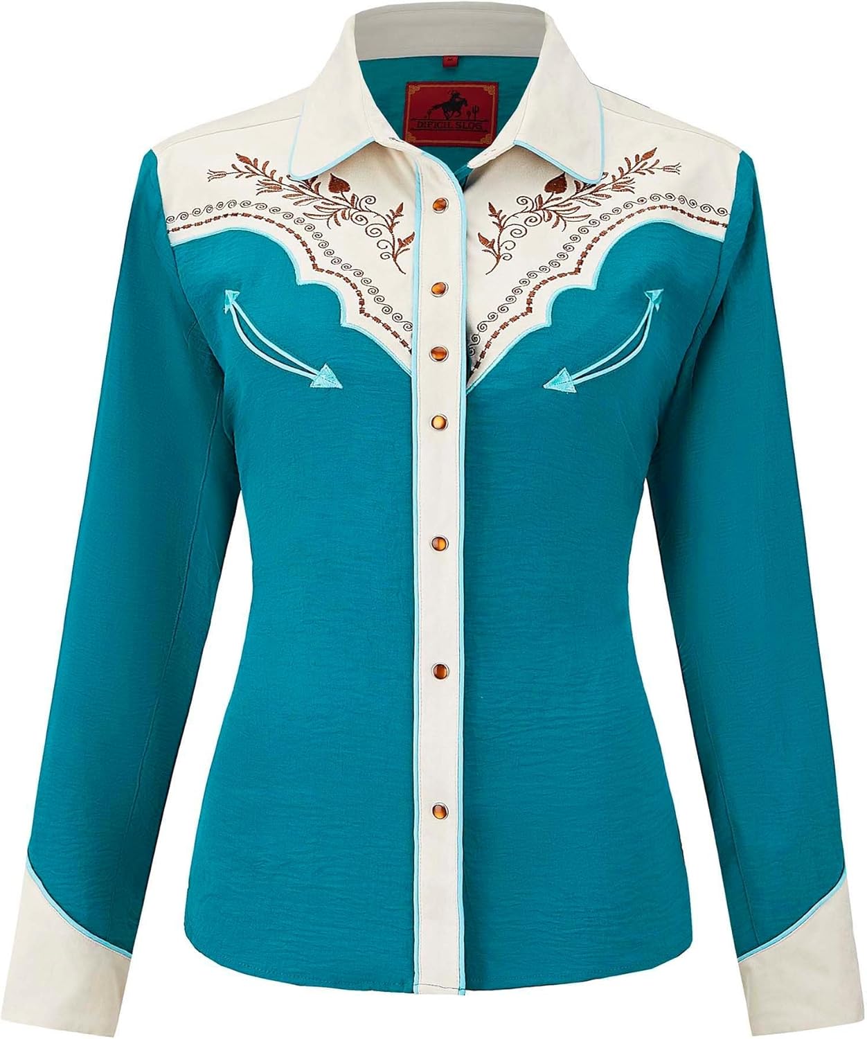 Women's Embroidered Western Cowgirl Snap Button Down Shirt with Stretch Long Sleeve Loose Blouse