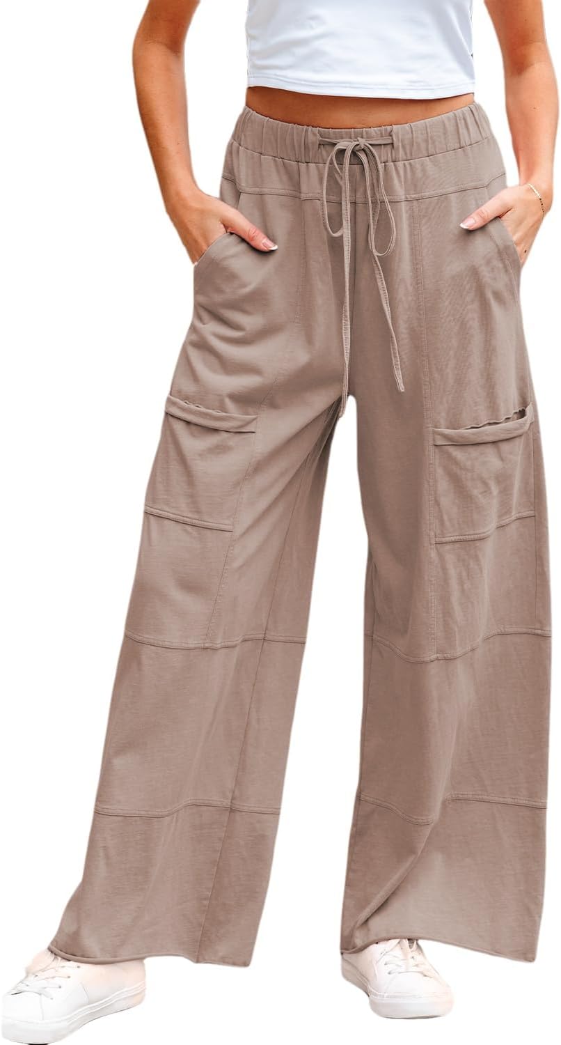 KevaMolly Womens Mineral Wash High Waist Lace-up Wide Leg Pants Casual Loose Lounge Trousers with Patched Pockets