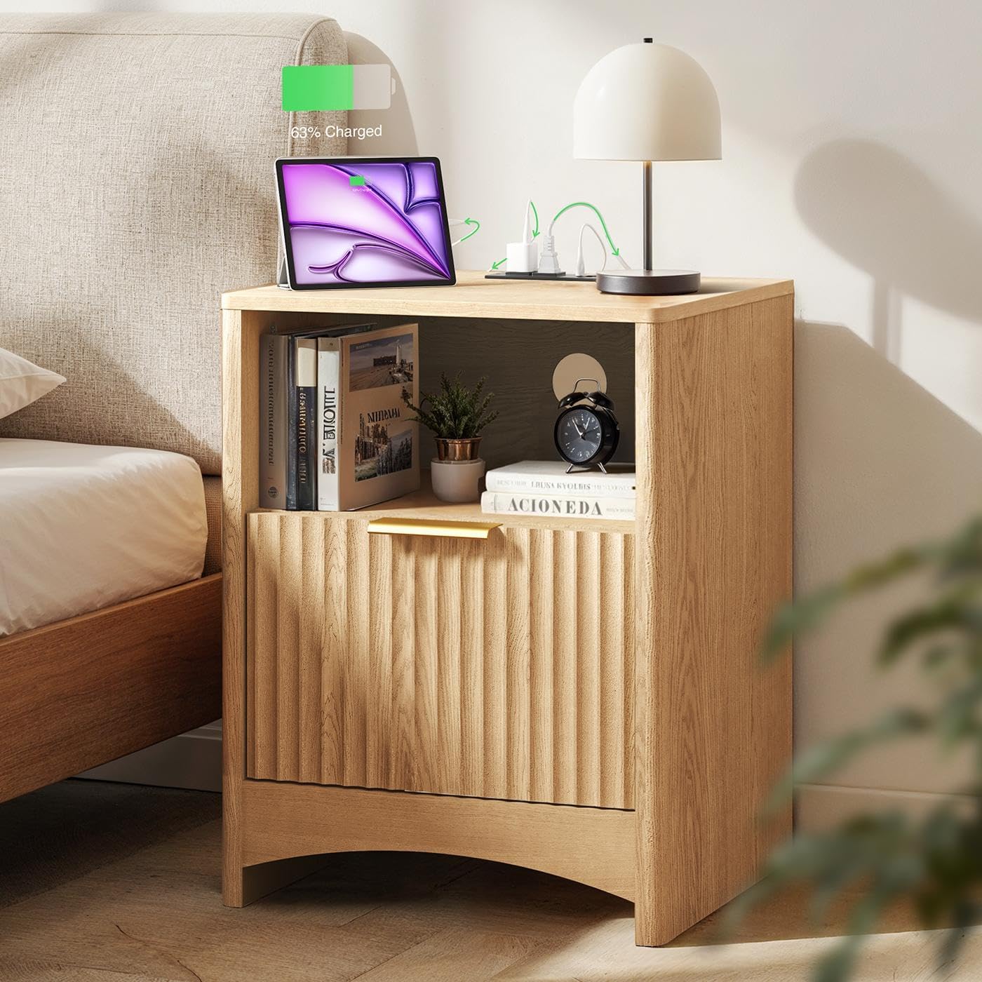Marsail Fluted Nightstand with Charging Station, Adjustable Bedside Table with USB & AC Ports, 1 Drawer End Table, Wood Grain Finish, Sleek Wide Handle, Perfect for Bedroom, Natural Oak