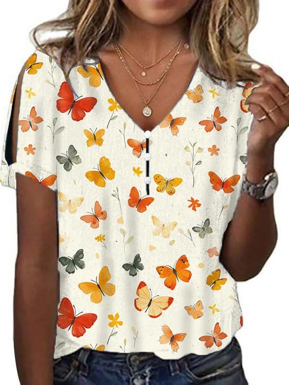 Women Casual Summer Boho Tops V Neck Loose Printed Short Sleeve Floral Blouses Cold Shoulder Peasant Tunic Shirts