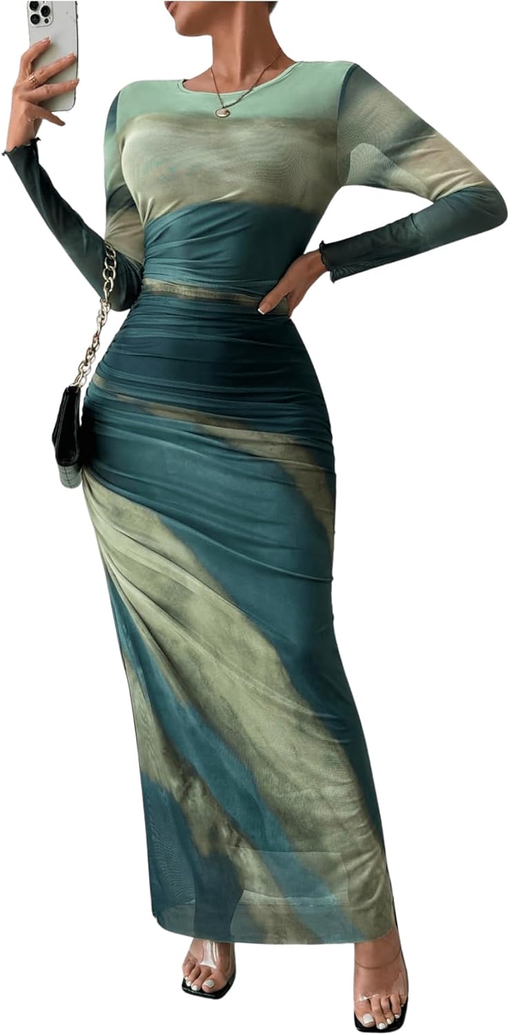 Milumia Women's Ruched Sheer Mesh Long Sleeve Dress Bodycon Long Maxi Dresses