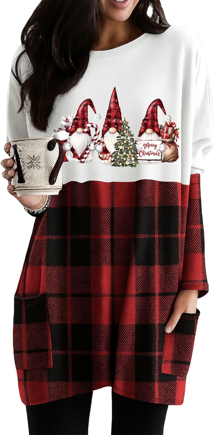 Womens Christmas Dress Long Sleeve Oversized Casual Plaid Sweatshirt Dress with Pockets