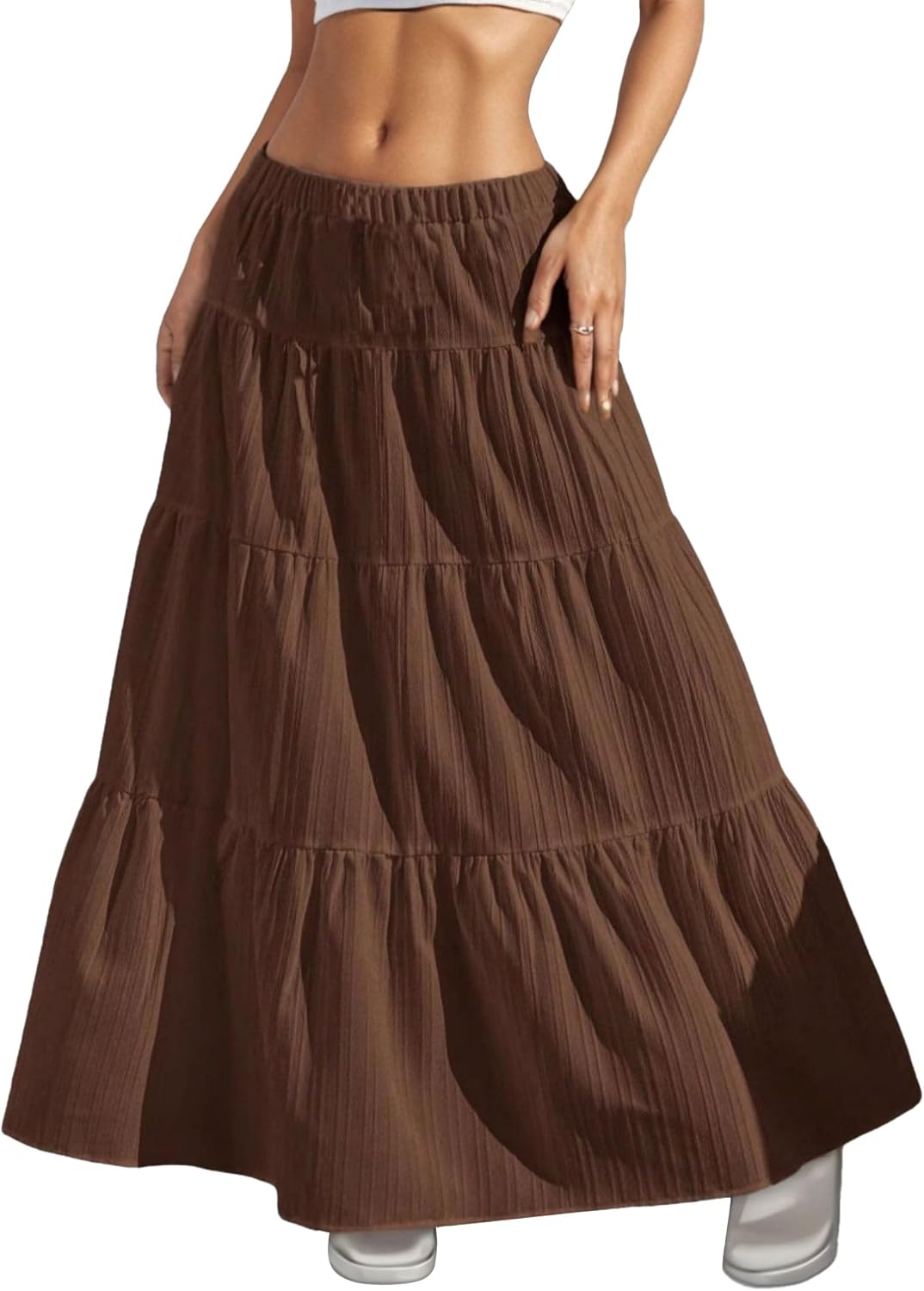 HOUZONIY Womens Maxi Skirt Flowy Elastic Waist Tiered Pleated A Line Summer Boho Trendy Cute Pull On Long Skirts