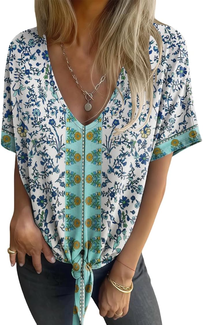 Women's Summer Tops Trendy V Neck Tie Front T-Shirt Casual Short Sleeve Loose Fit Top Blouses