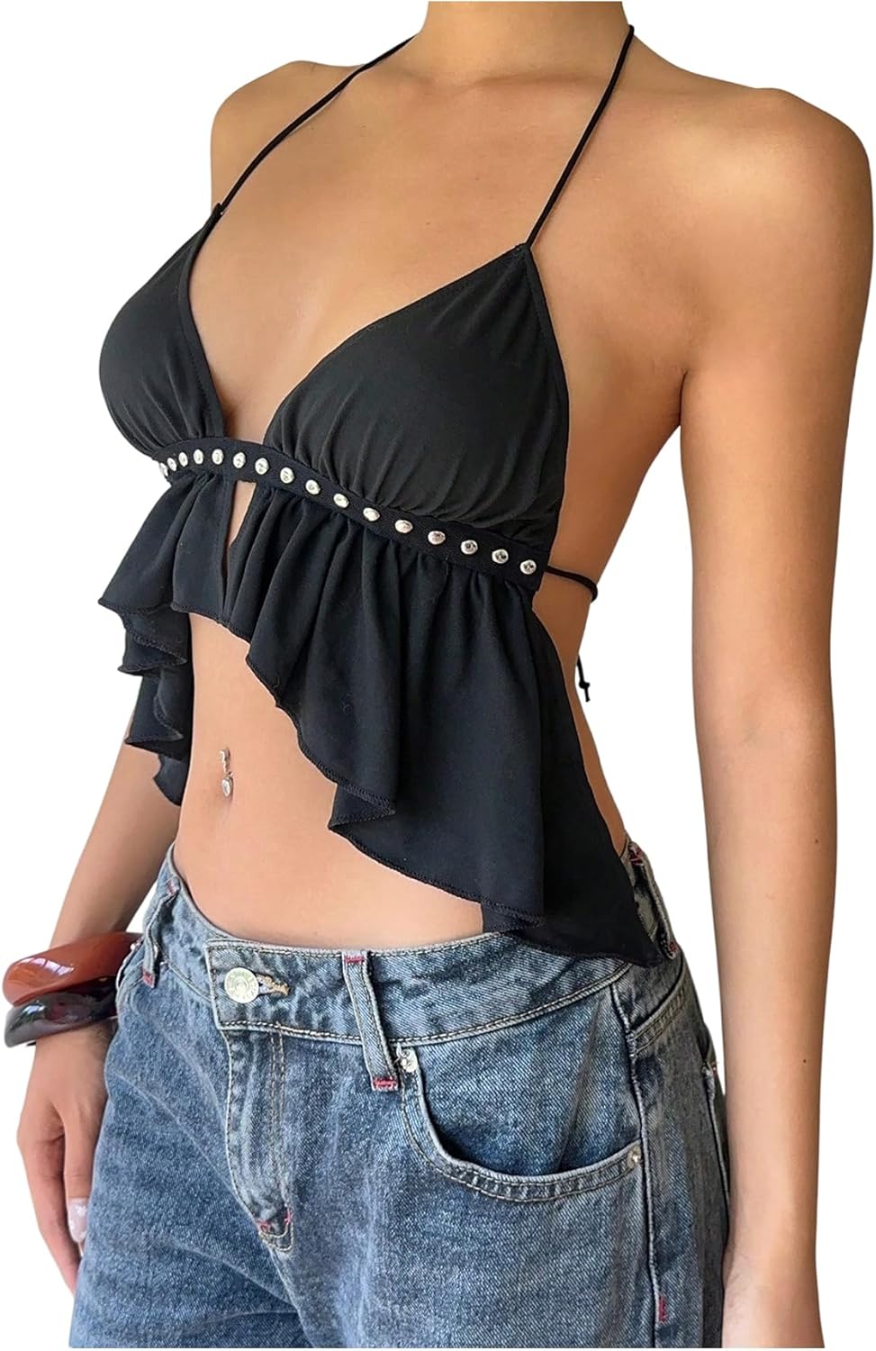 SOLY HUX Women's Halter Crop Tops Y2k Tie Backless Ruffle Asymmetrical Cami Shirts Party Club Outfit