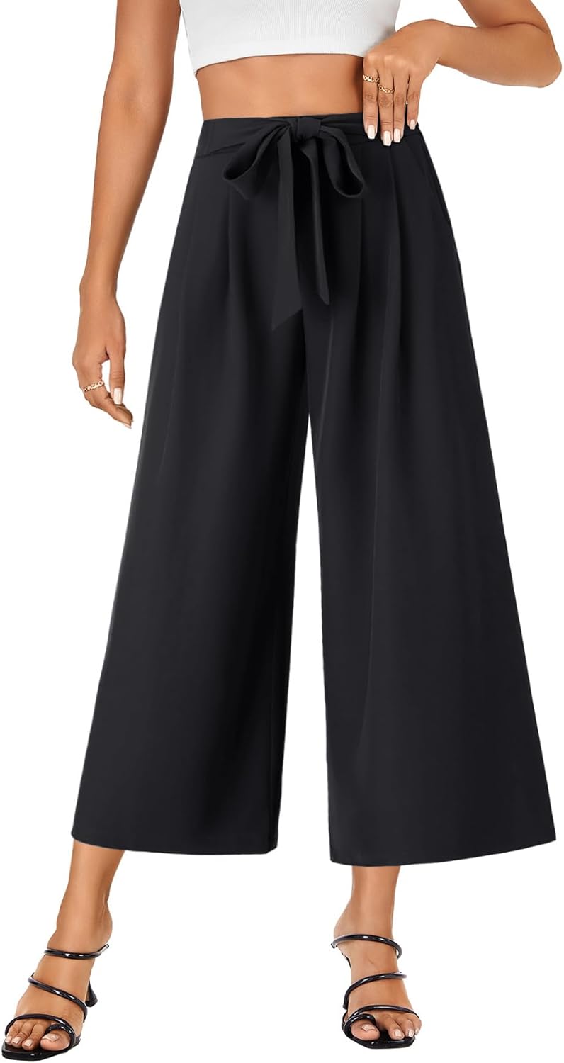 LYANER Women's Tie Front High Waist Pleated Lounge Wide Leg Cropped Pants with Pockets