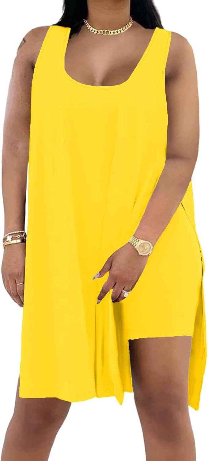 BeadChica Women's Plus Size 2 Piece Outfits Sleeveless Tunic Tops and Bodycon Shorts Tracksuit Sets-Yellow-S