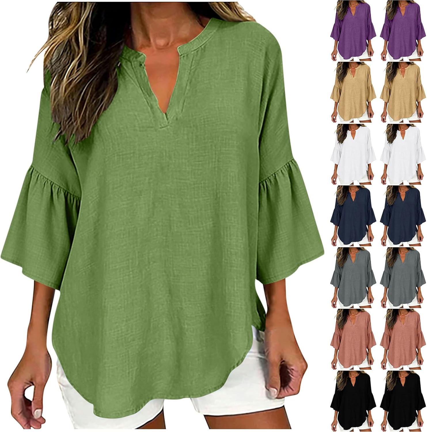 3/4 Sleeve Tops for Women Casual V Neck Linen Shirt Loose Fit Lightweight Fashion Gauze Blouses