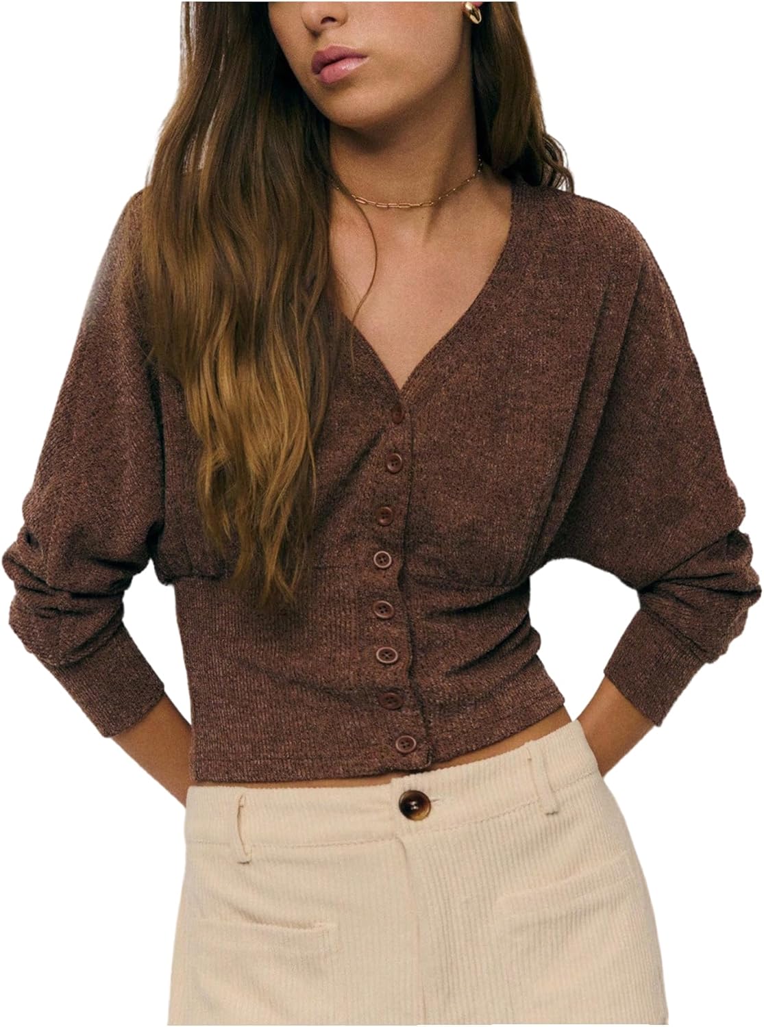 SOLY HUX Women's Long Sleeve Knit T Shirts Button Up V Neck Cardigan Fitted Crop Tops