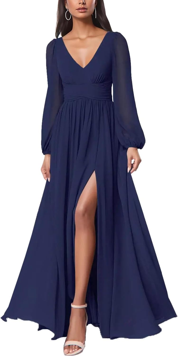 firfig Women Mesh Deep V Neck Open Back Sheer Long Sleeve Slit Leg Bridesmaid Maxi Dress Cocktail Party Wedding Guest Dresses