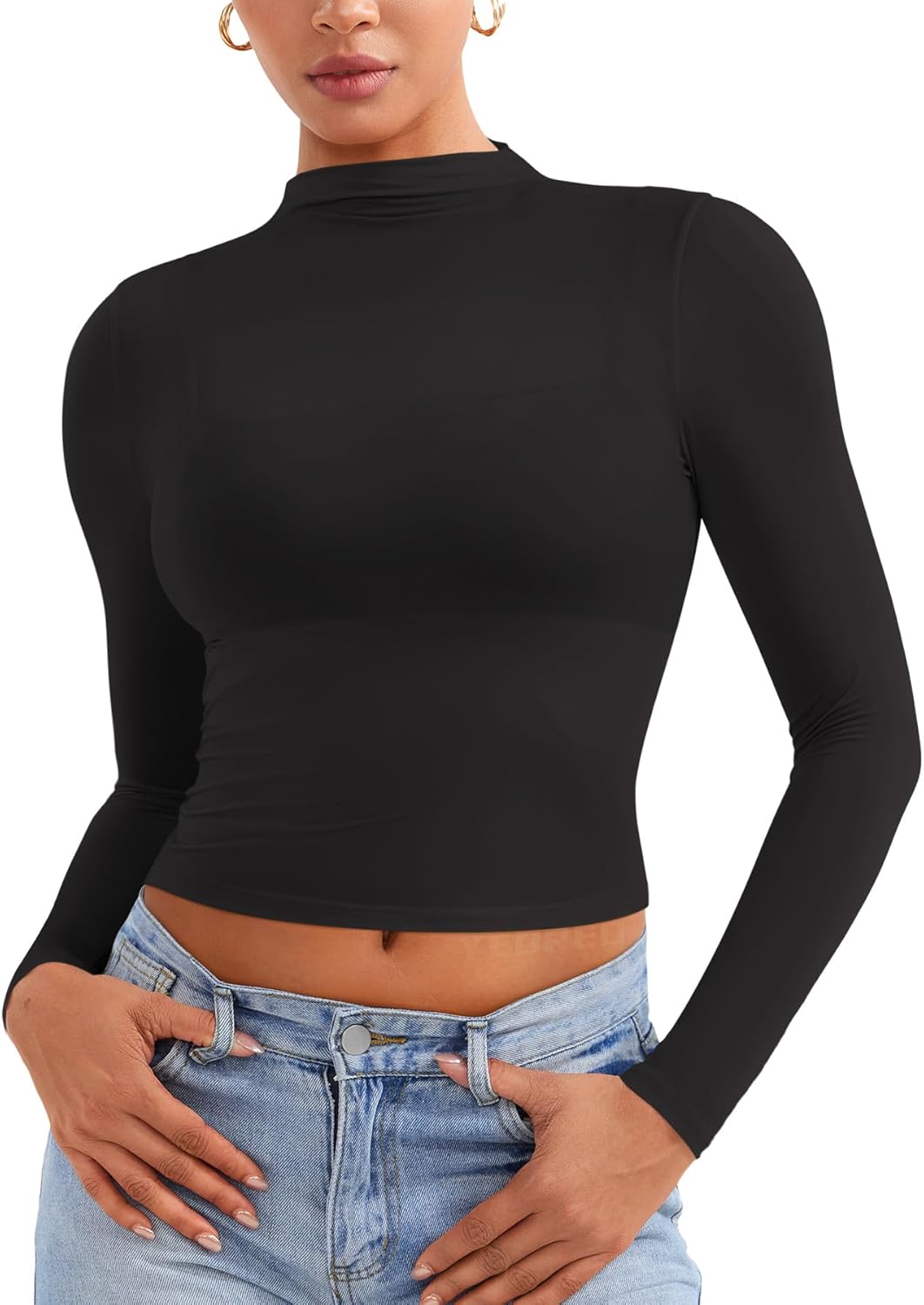 YEOREO Womens Sheer Tops Long Sleeve See Through Tops Mock Neck Slim Fit Workout Shirt Jamy Going Out Sexy Shirts