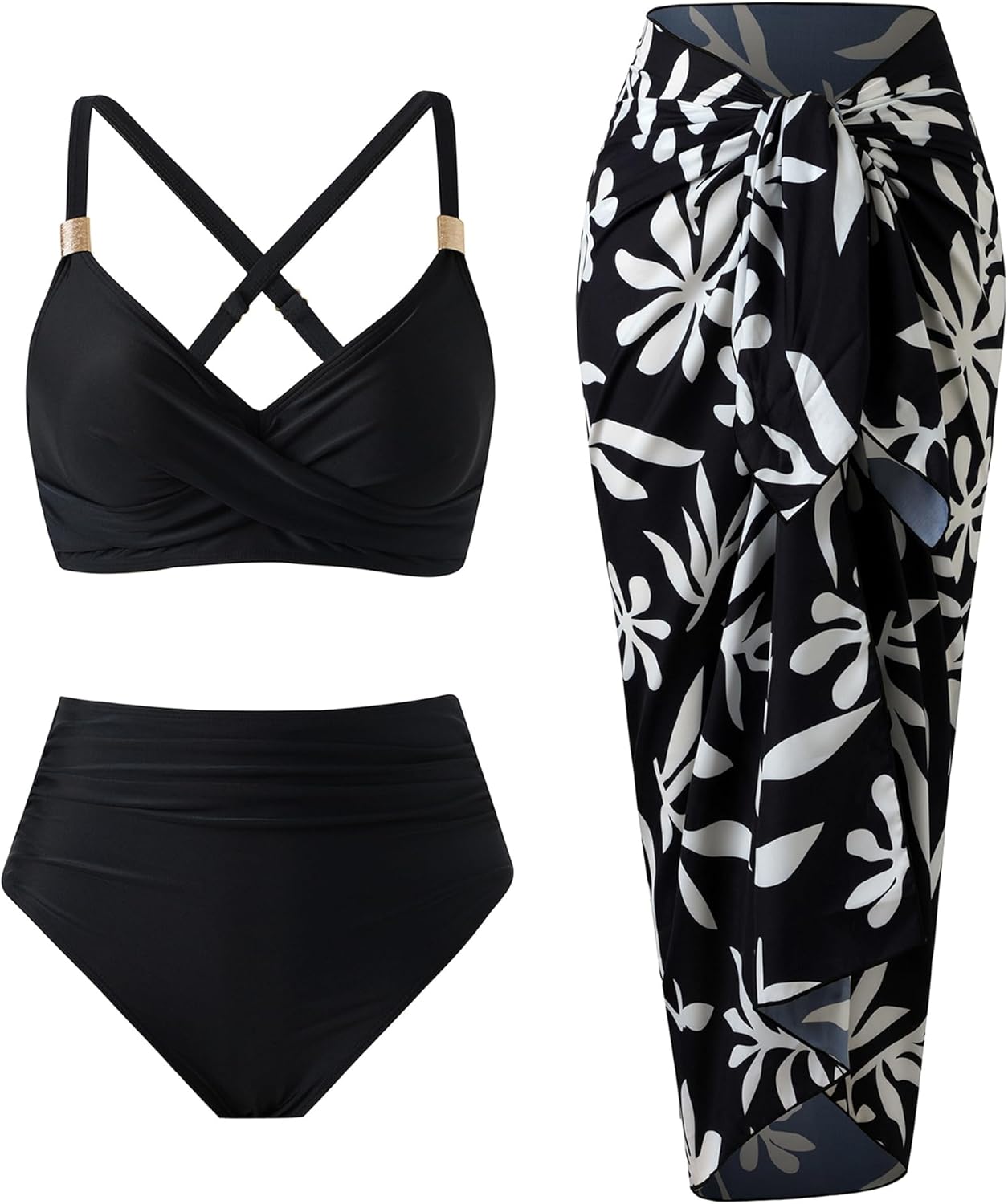 High Waisted Bikini Sets for Women 3 Piece Swimsuits Retro V Neck Cross Back Bathing Suit with Cover Up