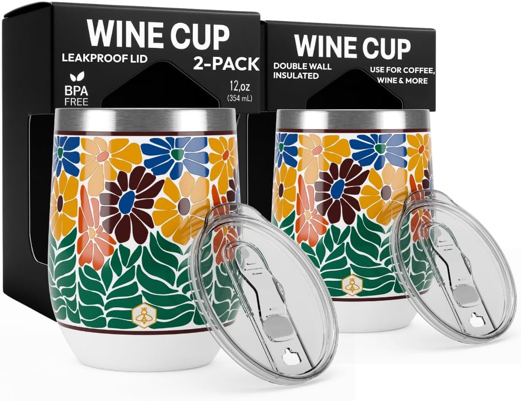 Biddlebee 12 Oz Stainless Steel Wine Tumblers with Slider Lids, 2-Pack – Double Wall Insulated Cups for Wine, Coffee, Cocktails, or Tea – Keeps Drinks Hot or Cold for Hours (Retro Floral Faith)