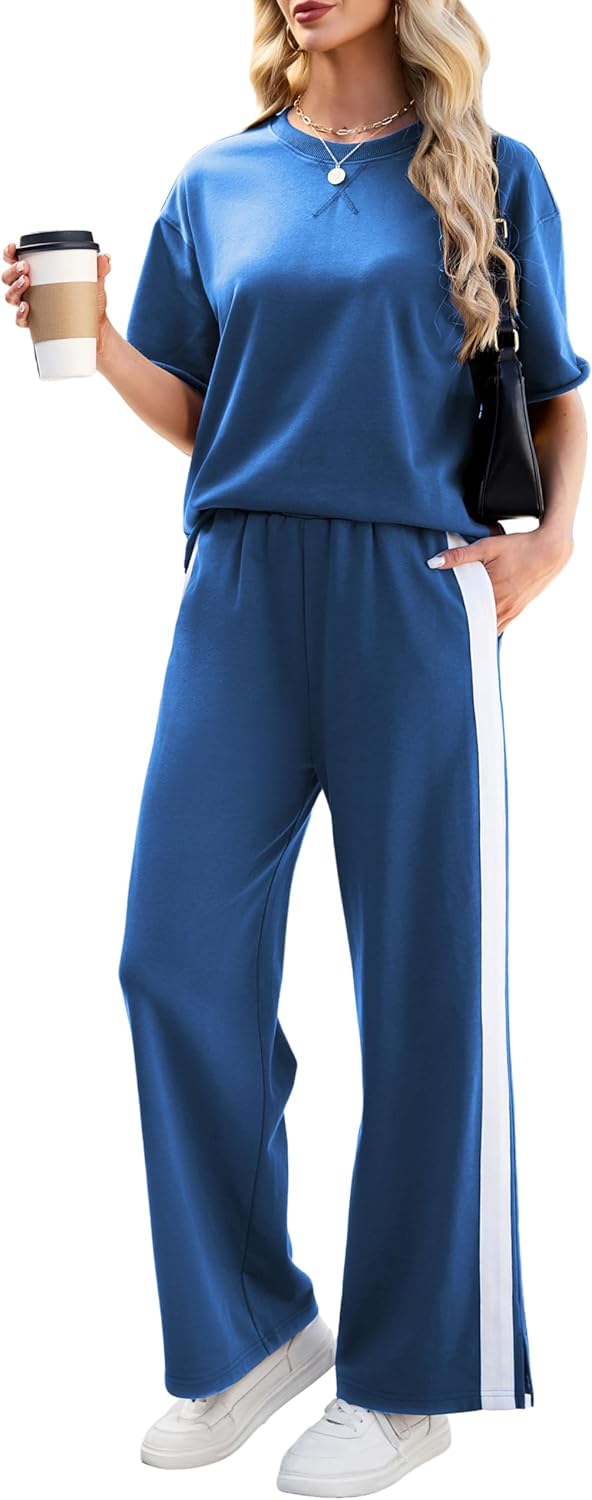 Tanming Two Piece Sets for Women Travel Vacation Outfits Lounge Sets Short Sleeve Tops Striped Wide Leg Pants Tracksuits