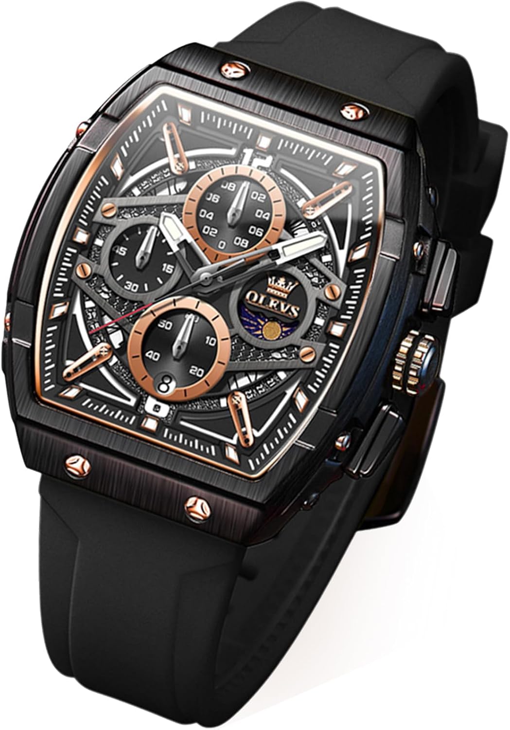 OLEVS Watch Men Casual Luxury Square Large Face Skeleton Multifunctional Chronograph Men's Watches Fashion Silicone Waterproof Mens Watches with Date Moon Phase Analog Wrist Watch Reloj para Hombre
