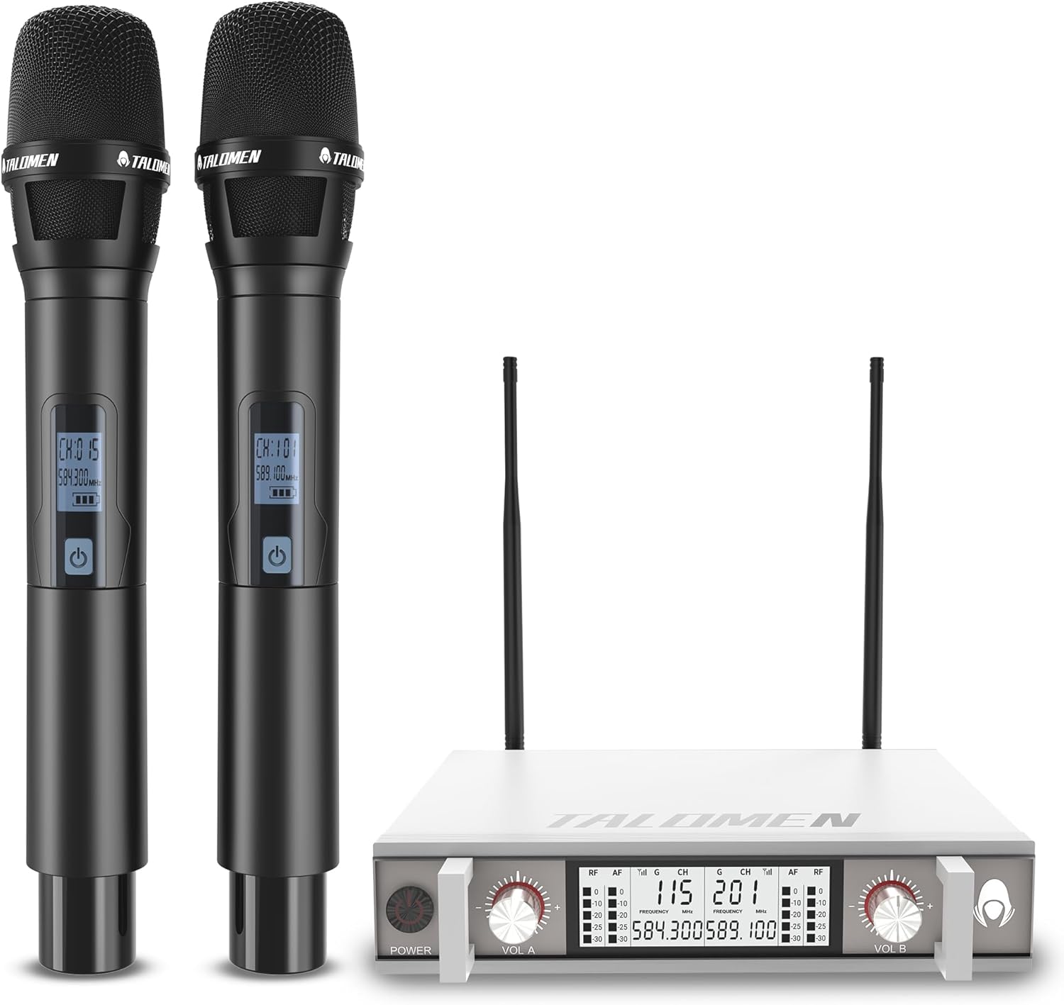 - 🏆Enhanced Signal Stability - The talomen K120 UHF wireless microphone system (White Edition) is designed with dual channels (580.1-584.3 MHz & 589.1-593.3 MHz), offering 15 adjustable frequencies per channel to support up to 15 sets of devices simultaneously. Whether you're setting up for a home party or wedding ceremony, this wireless microphone & system delivers reliable, interference-free audio. With easy IR syncing and optimized signal filtering, the wireless DJ microphone system keeps your voice crystal clear during any celebration or event.