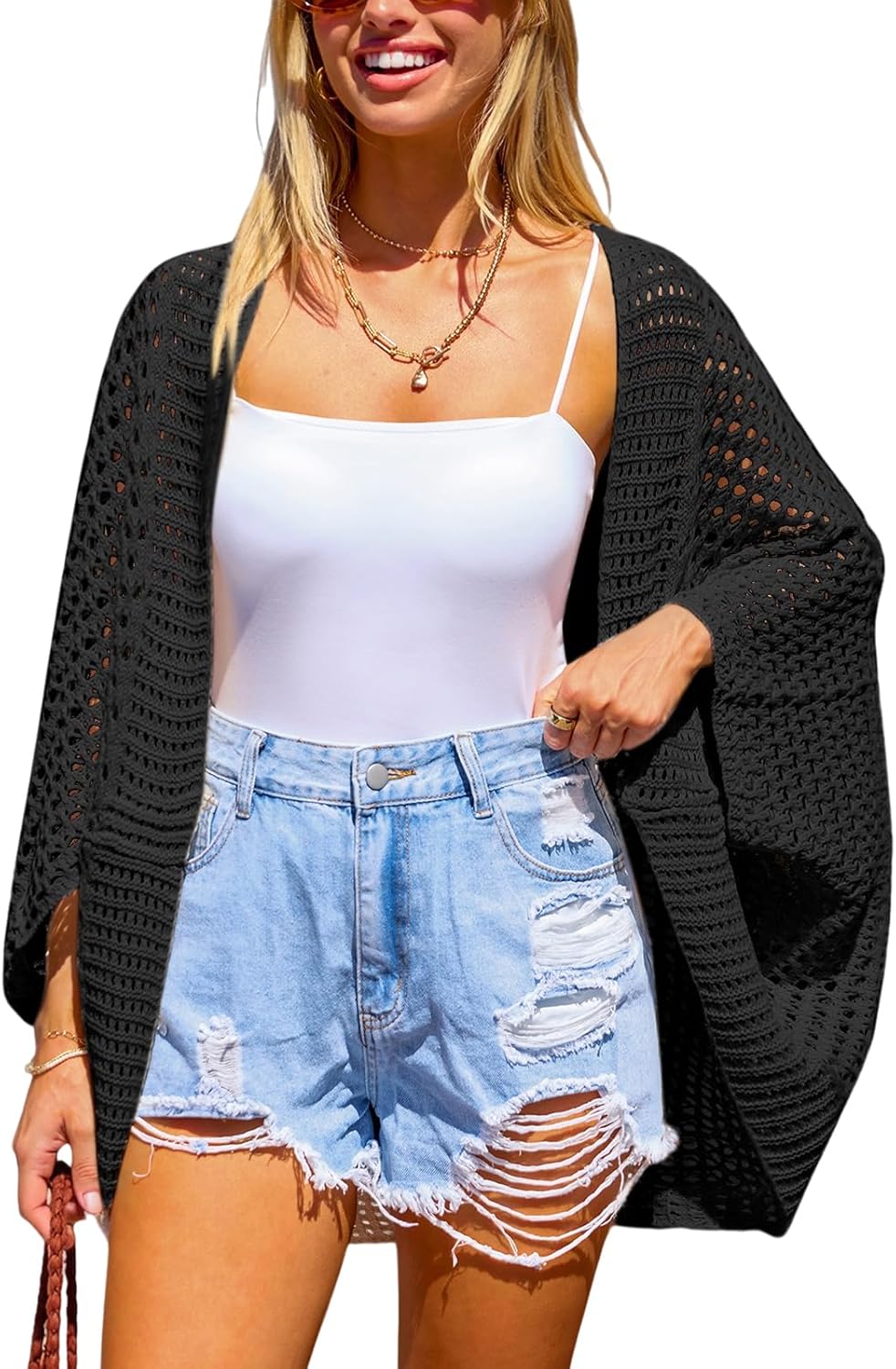 CUPSHE Women's Knit Open Front Long Dolman Sleeves Beach Crocheted Cover-Up Vacation