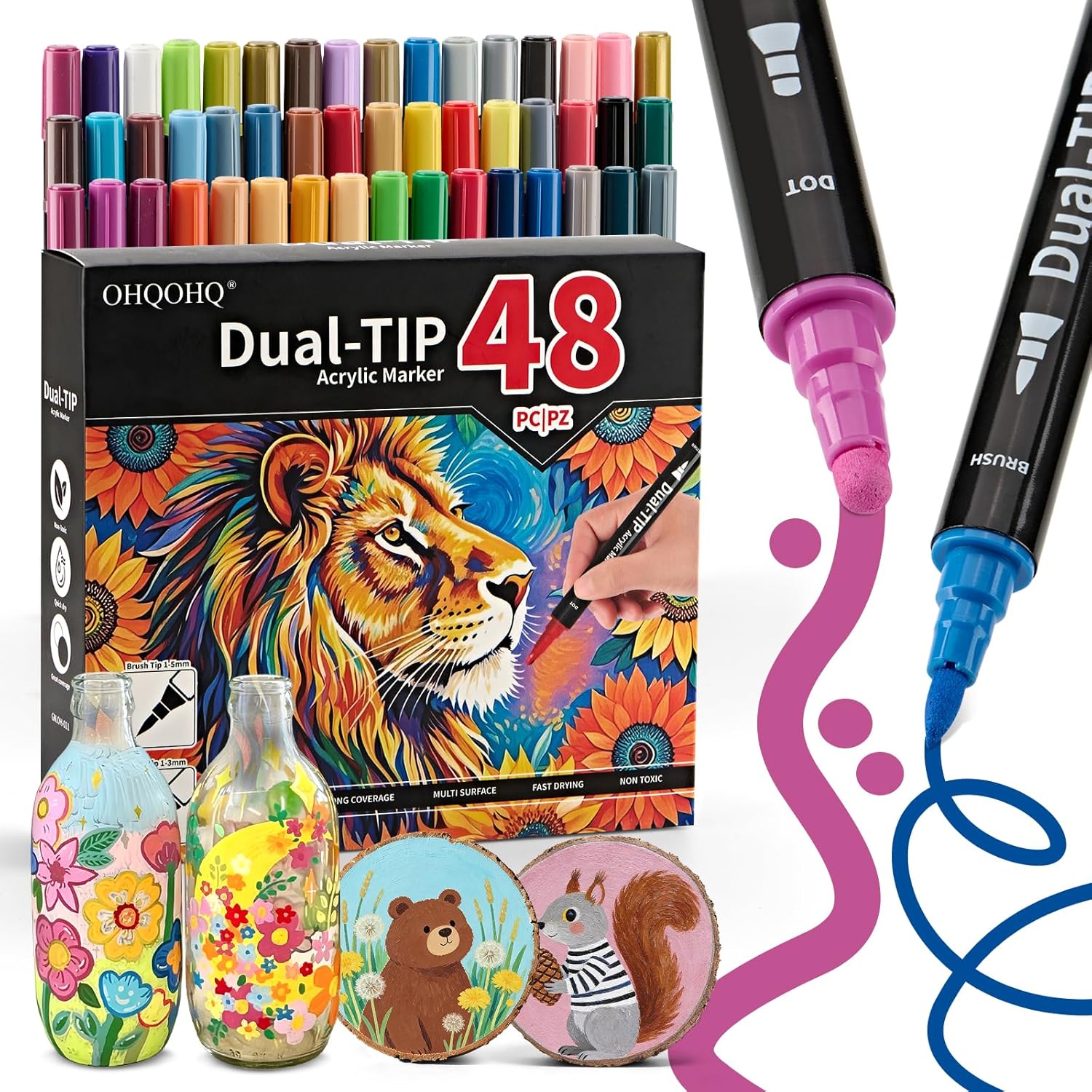 - Dual Tips for Lines & Brushstrokes:OHQOHQ 48 colors acrylic paint markers feature a fine tip for intricate details, outlines and calligraphy, and a flexible brush tip for smooth fills and expressive strokes—effortlessly switch between precise line work and bold sweeps.