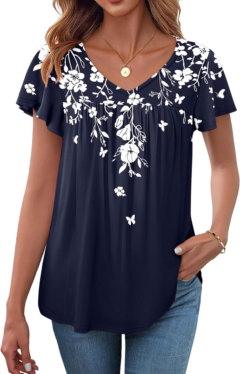 Zeagoo Women Tops Summer Ruffle Short Sleeve Shirts V Neck T Shirts Pleated Tunic Tops Work Blouses Business Outfits