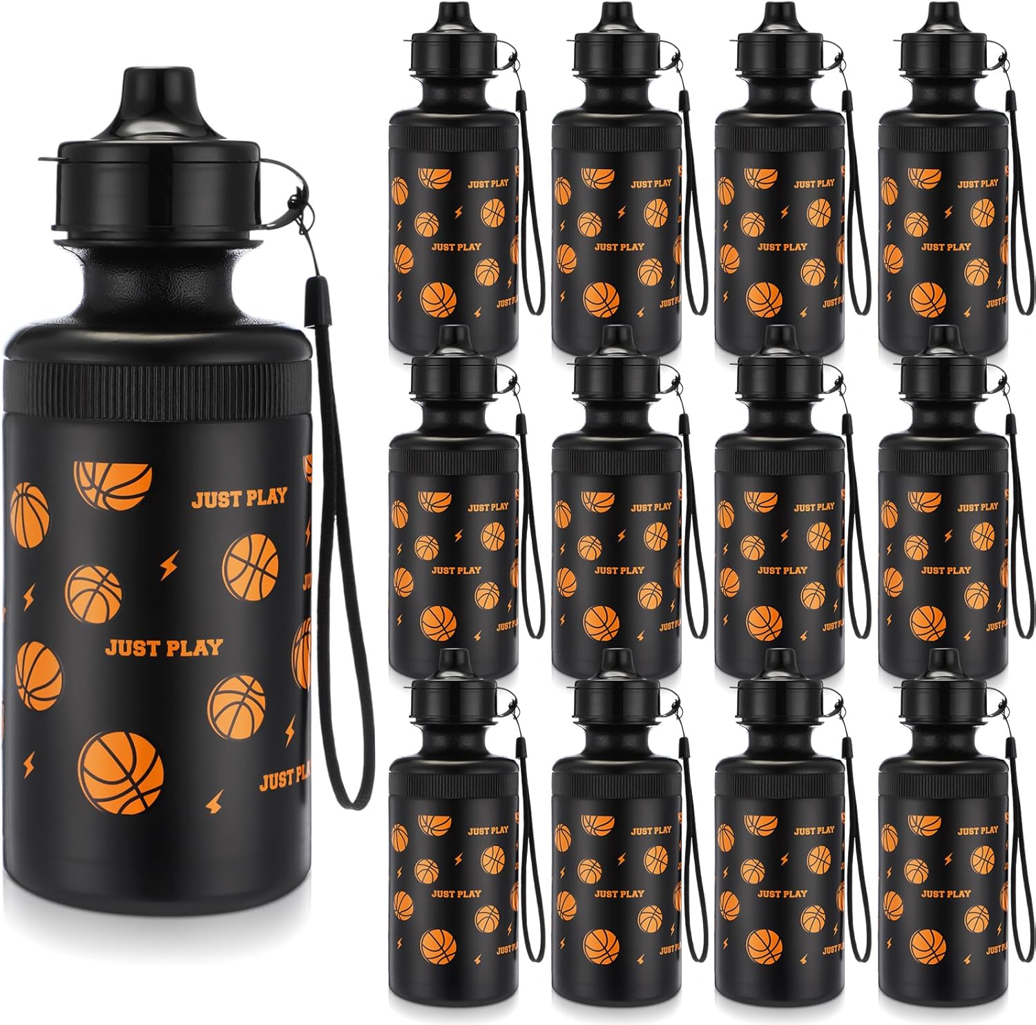 Maxdot 12 Pcs Basketball Water Bottles Bulk 18 oz Squeeze Reusable Plastic Water Bottle with Nylon Strap Leak Proof Sport Theme Cup for School Basketball Team Grad Gift(Black)