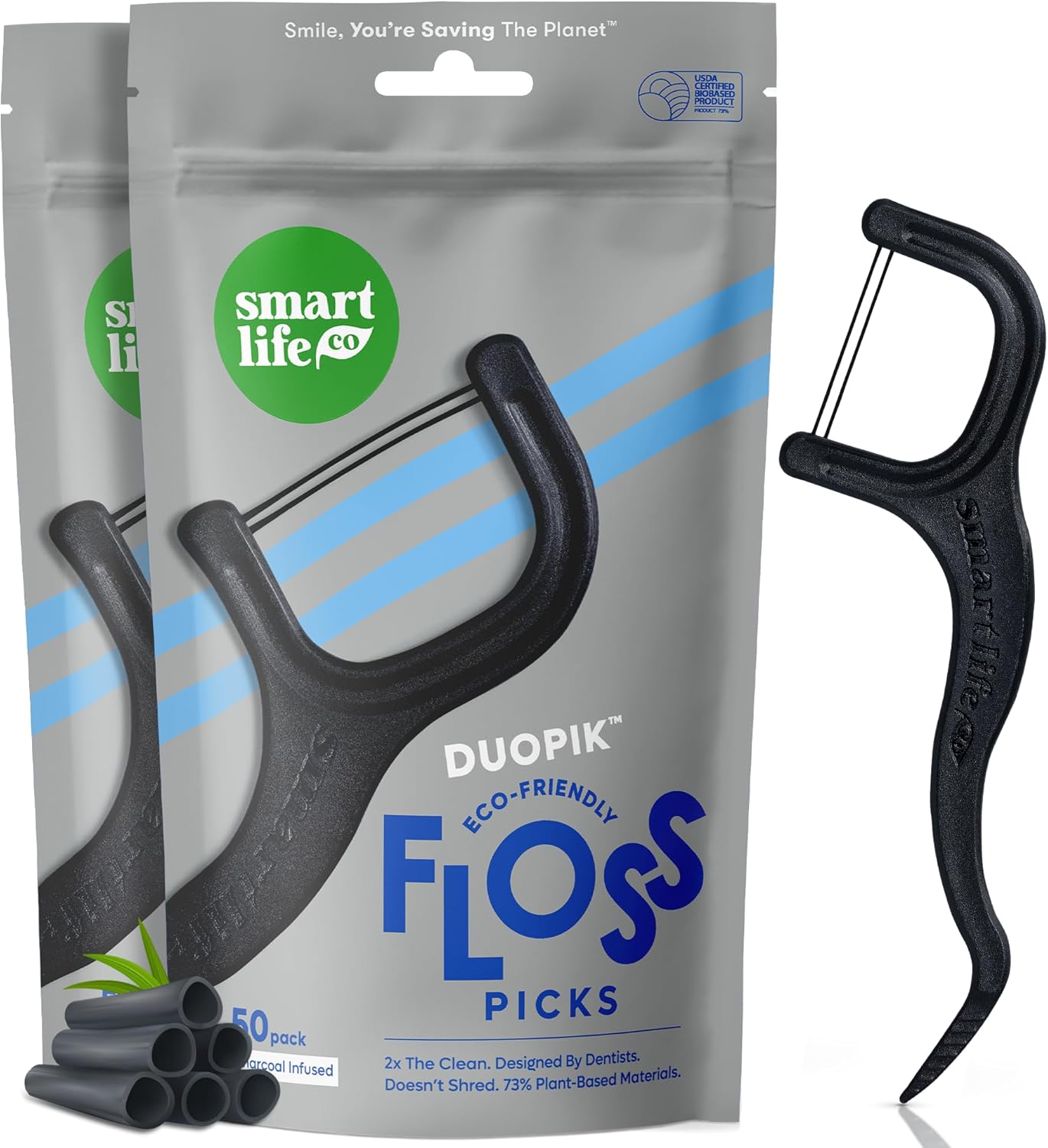 SmartLifeco Eco-Friendly Dual-Thread Dental Floss Picks (100ct) - Flossers Made with Straw Wheat Blend, Natural Teeth Whitening, Tooth Pick Stick for Adults, Activated Bamboo Charcoal Floss Thread