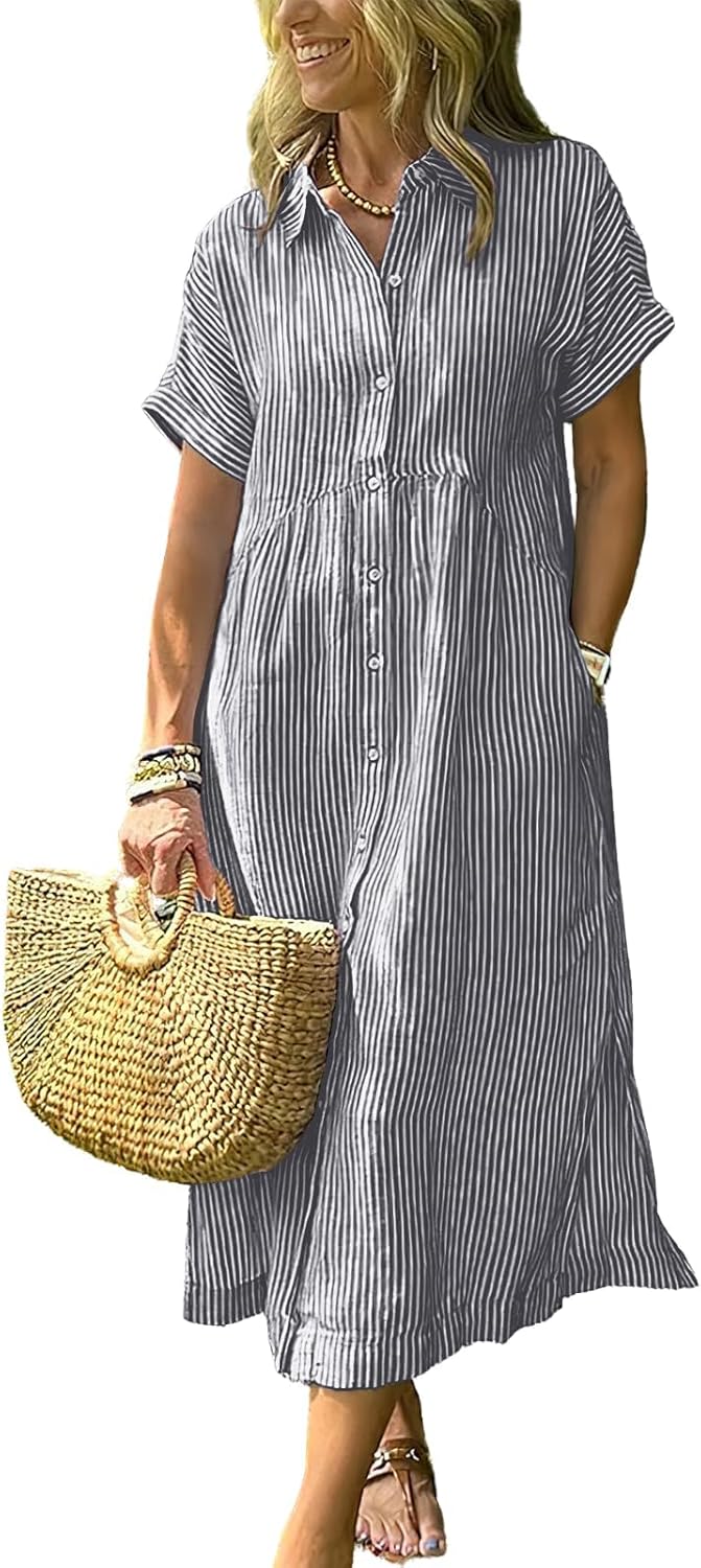 ebossy Women's Boho Striped Shirt Dress Button Up Side Slit Loose Mid Long Cotton Dress with Pockets