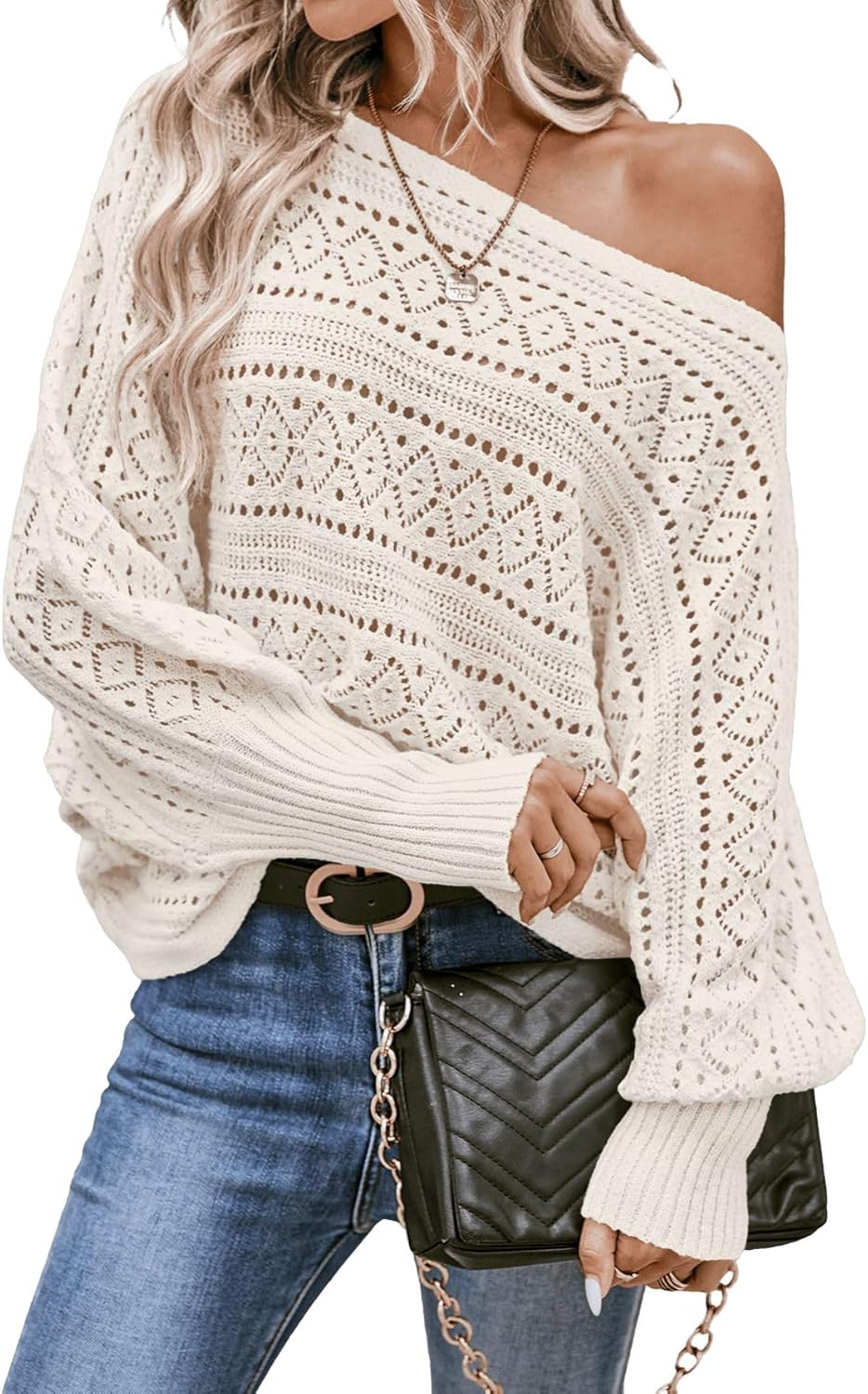 Verdusa Women's 2026 Off The Shoulder Sweater Crochet Dolman Sleeve Oversized Boat Neck Long Sleeve Pullovers