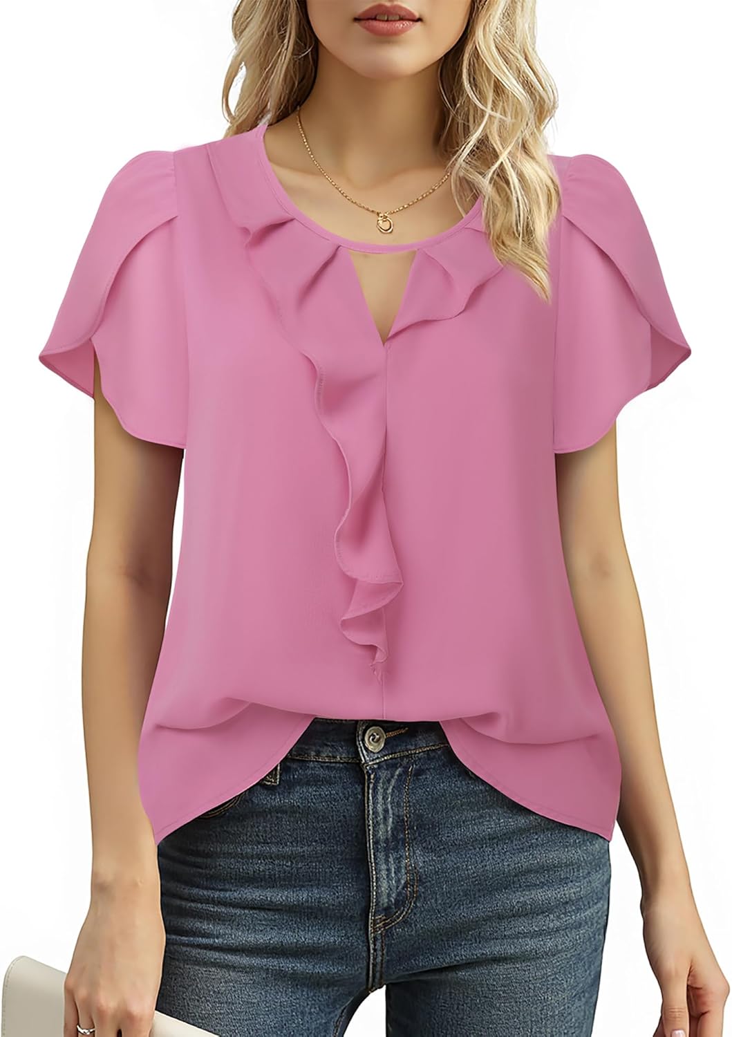 Messic Womens Shirts Dressy Casual Short Sleeve Tops Dressy Casual Blouses Summer Outfits Flowy Pleated Front V Neck