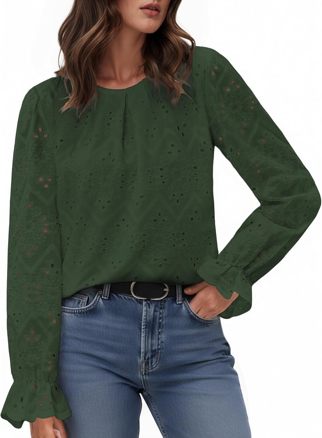 Womens Eyelet Tops Dressy Casual Long Sleeve Pleated Blouses 2025 Trendy Fall Crewneck Embroidered Lace Shirts
