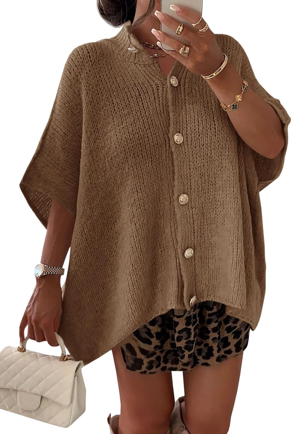 Saodimallsu Womens Oversized Cardigan Sweaters Short Sleeve Button Down Casual Lightweight Loose Knit Trendy Cardigans Brown