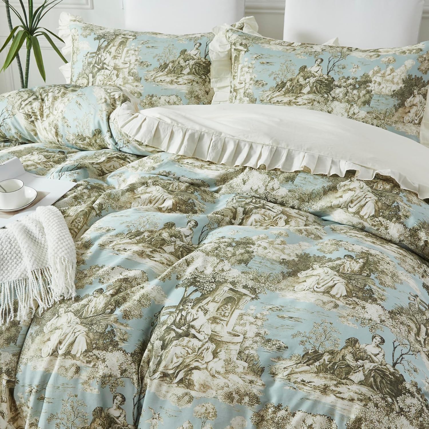 - Classic French Toile Design: Inspired by 18th-century pastoral art, the bedding features elegant countryside scenes in a vintage toile pattern — a timeless symbol of sophistication and romance.Delicate ruffle trim adds texture and charm, enhancing the romantic cottagecore and French country aesthetic.