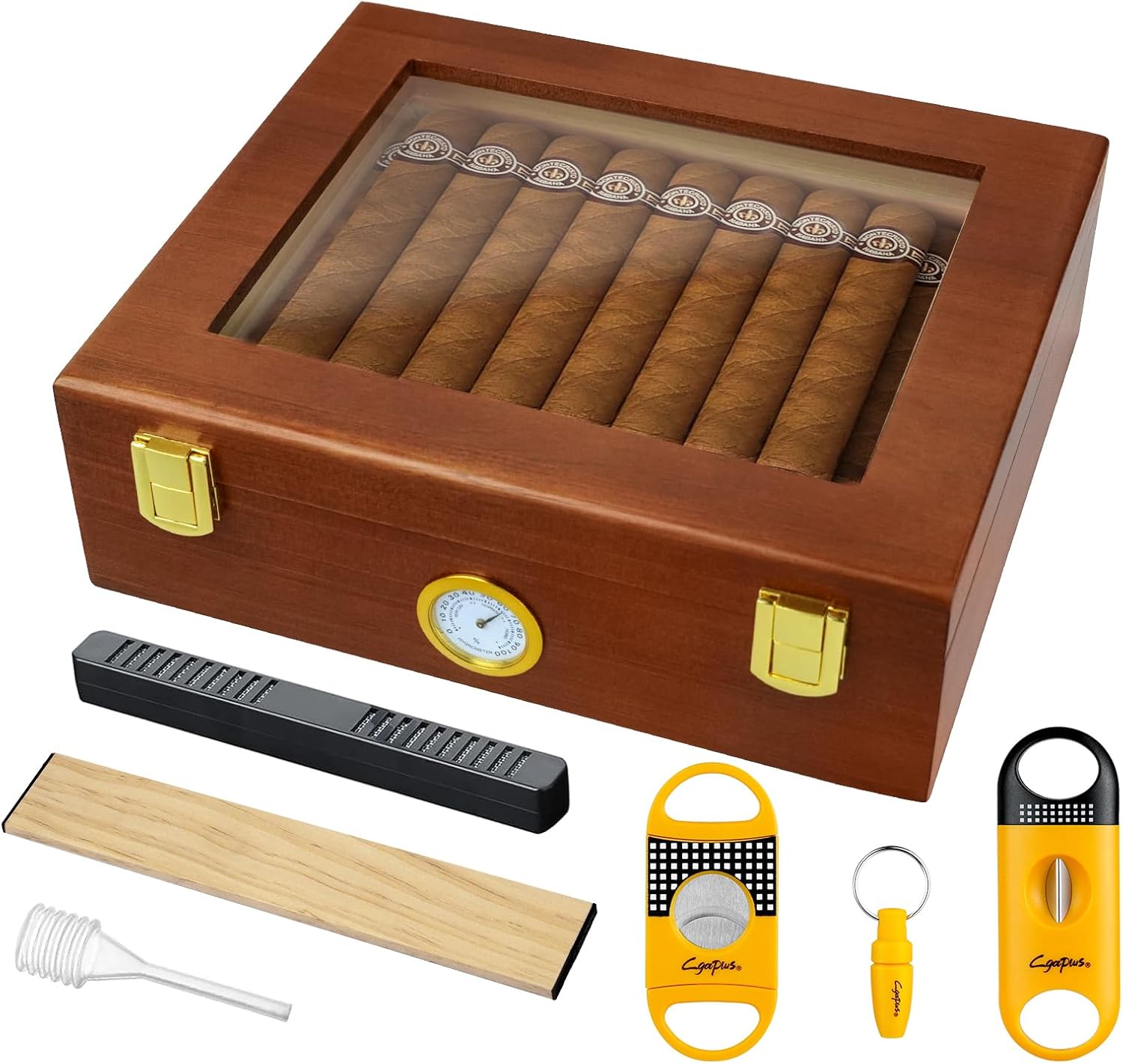 - Premium Cigar humidor Set: Comes with dropper, humidifier,a sharp cigar cutter and cigar punch, so you have everything needed to keep your cigars in perfect condition. No more searching for separate accessories!