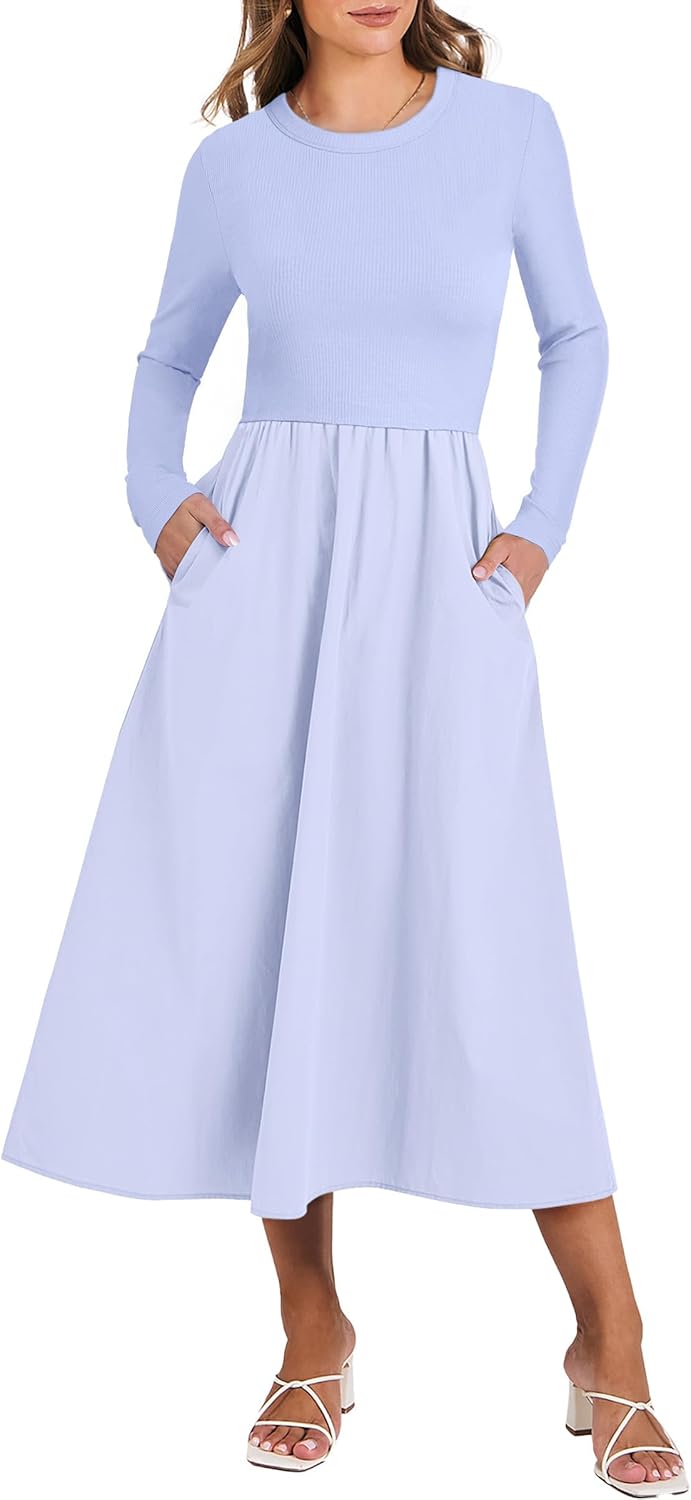ANRABESS Long Sleeve Midi Dresses for Women 2025 Fall Fashion Casual Rib Knit Patchwork Tight Top Modest Flowy Dress Pocket