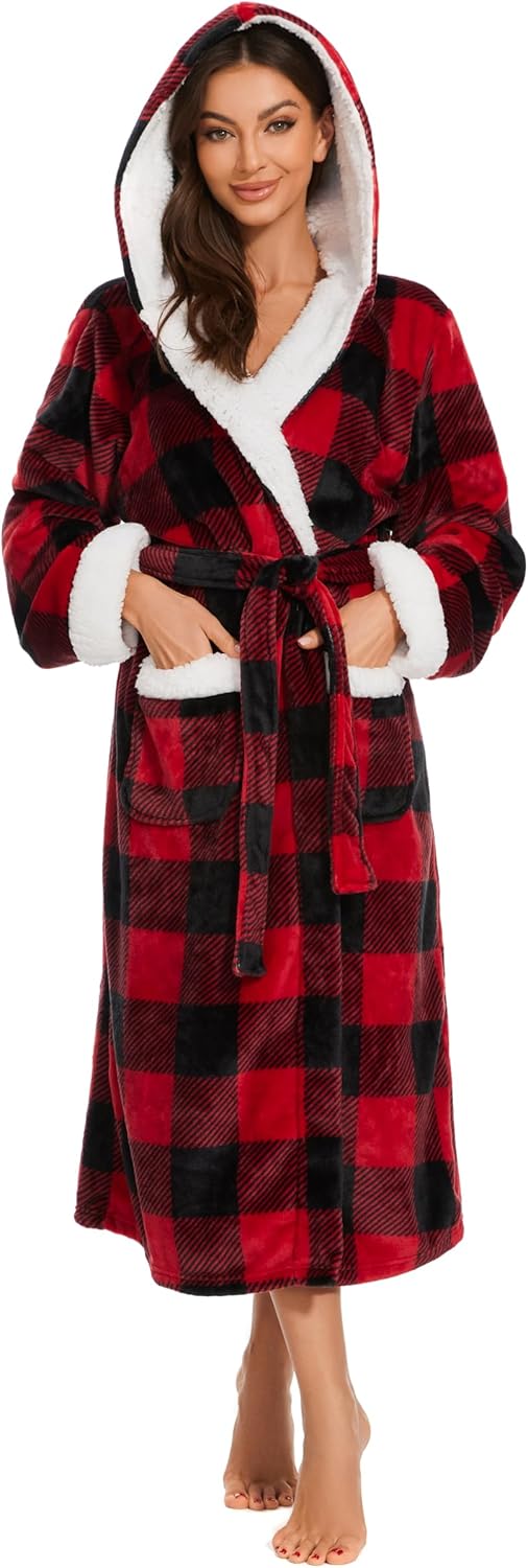 iniber Plush Robes for Women, Womens Robe Long, Fuzzy Fluffy Soft Warm Fleece Hooded Bathrobe