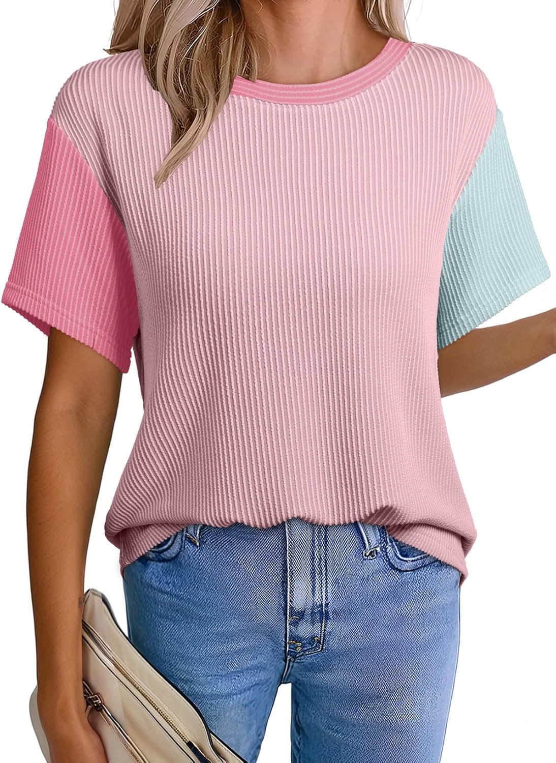 EVALESS Women's Short Sleeve T Shirts Ribbed Knit Crewneck Multicolour Block Tee Blouses Spring Tops 2026 Trendy
