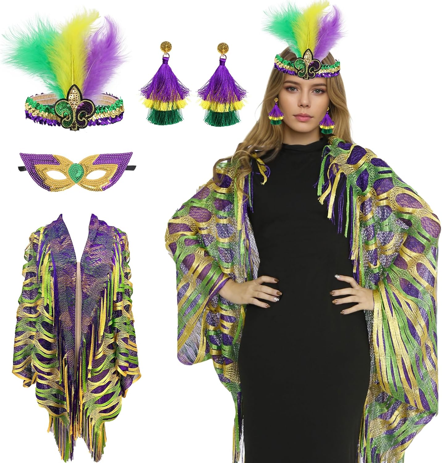 Aitsite 4Pcs Mardi Gras Outfit for Women,Shawl Scarf with Mardi Gras Accessories Including Mask Feather Headband Earrings