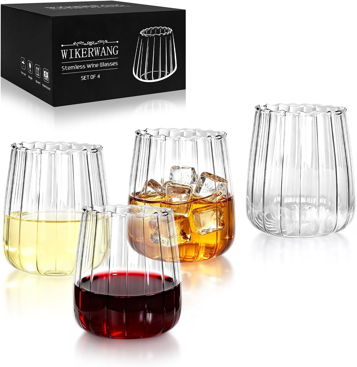 Stemless Wine Glasses Set of 4, 17oz, Hand Blown Crystal Clear Red White Wine Glasses for Daily Use, Lead-free, Dishwasher Safe, Glasses Drinking Set, Ideal for Home Bar, Parties & Gifts