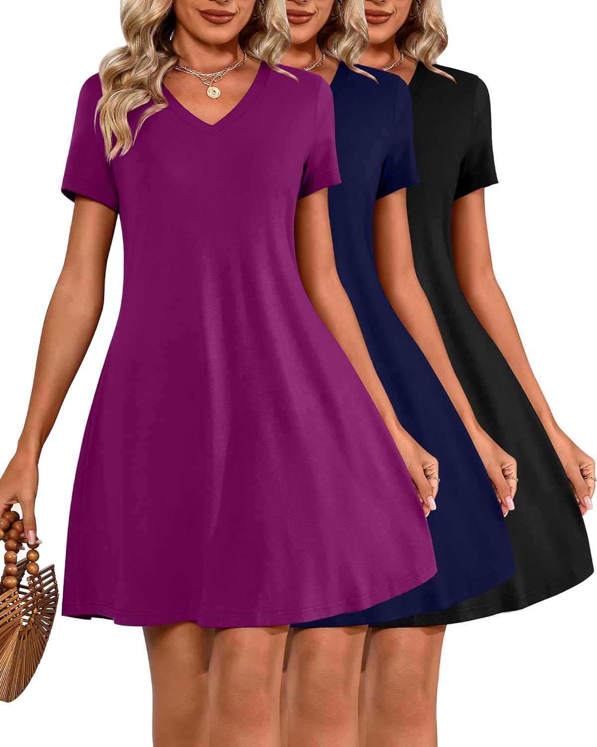 Huukeay 3 Pack Women's V Neck Short Sleeve T Shirt Dress Trendy Basics Dress