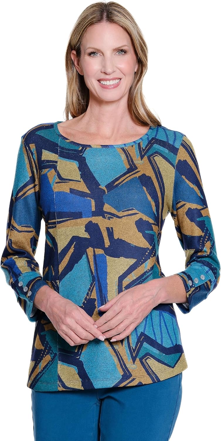 MULTIPLES Women's 3-Button Cuff 3/4 Sleeve Scoop Neck Zip Pocket Top