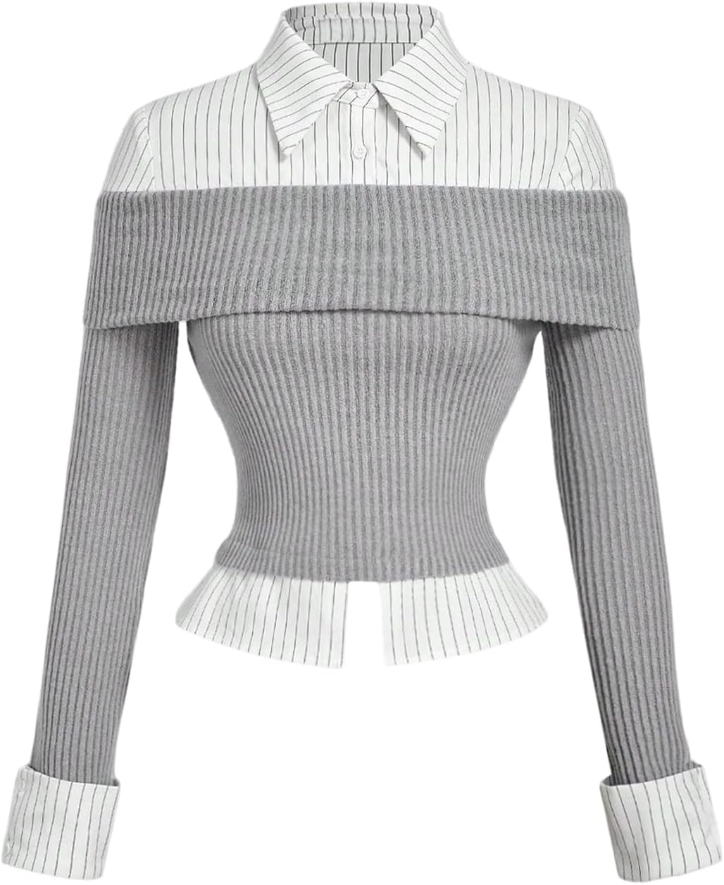 MakeMeChic Women's Fall Teacher Outfits Striped Long Sleeve 2 in 1 Retro Blouse Collared Shirt