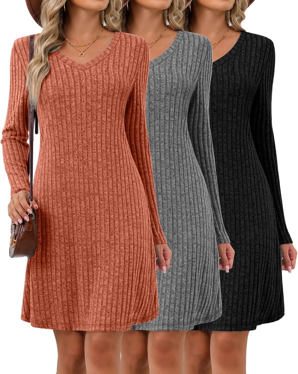 Riyiper 3 Pack Women's V Neck Long Sleeve Dresses, Knit Fall Winter Casual Loose Fit Tunic Sweater Dresses