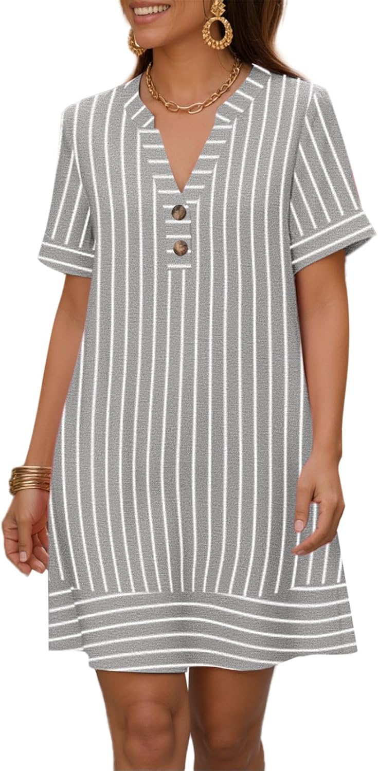Summer Dresses for Women Casual Short Sleeve V Neck Sundresses Striped Printed Short Dress with Pocket