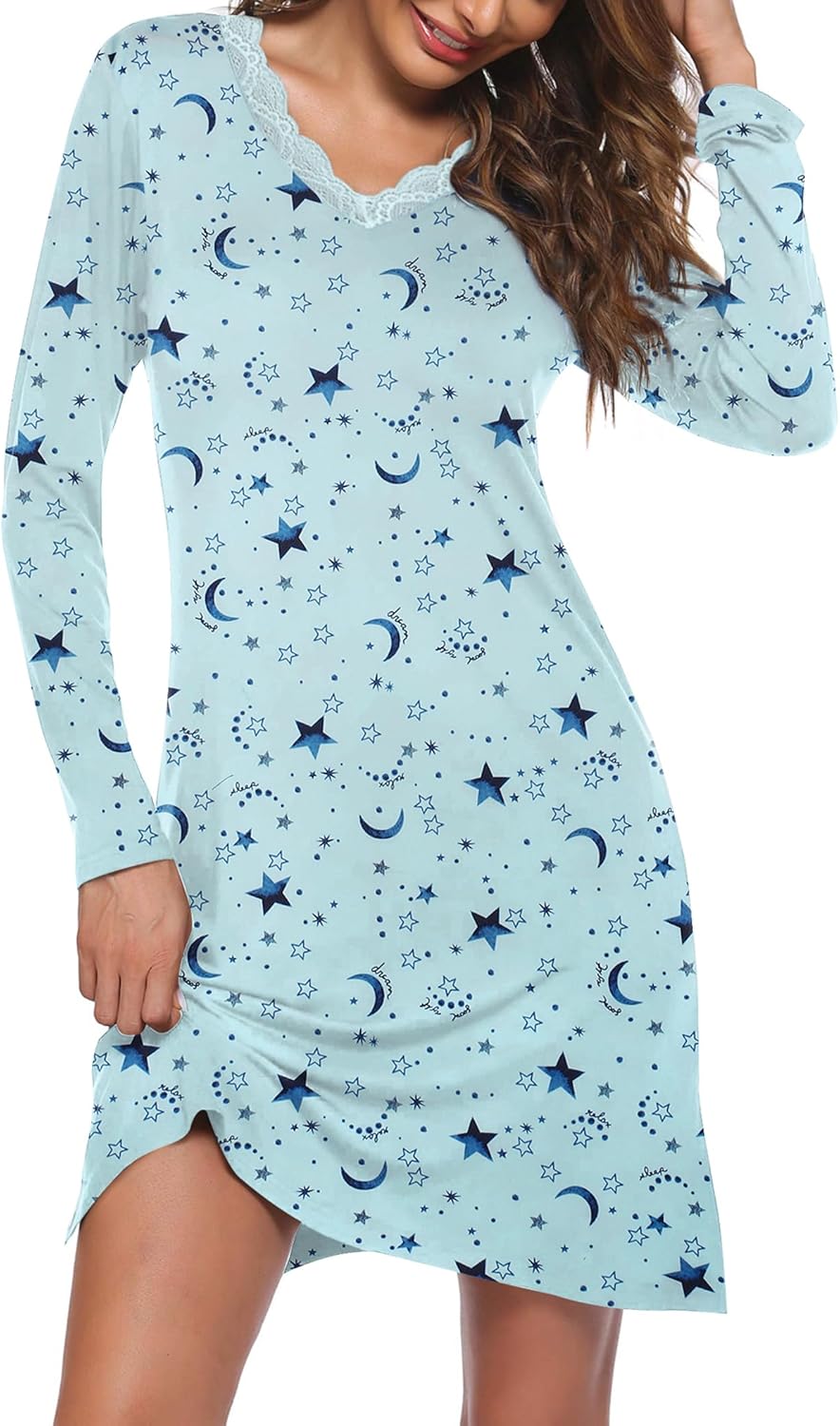 Ekouaer Long Sleeve Nightgowns for Women Sexy Lace Night Shirt V Neck Sleep Shirt Soft Sleepwear