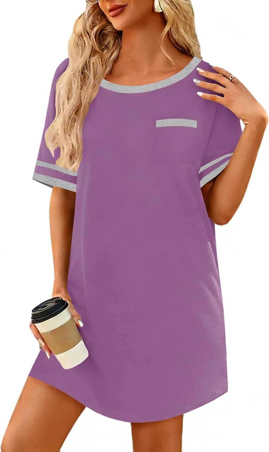 Ekouaer Cotton Nightgowns for Women Soft Sleepwear Comfy Short Sleeve Sleep Shirts Crew Neck Night Shirts with Pocket S-3XL