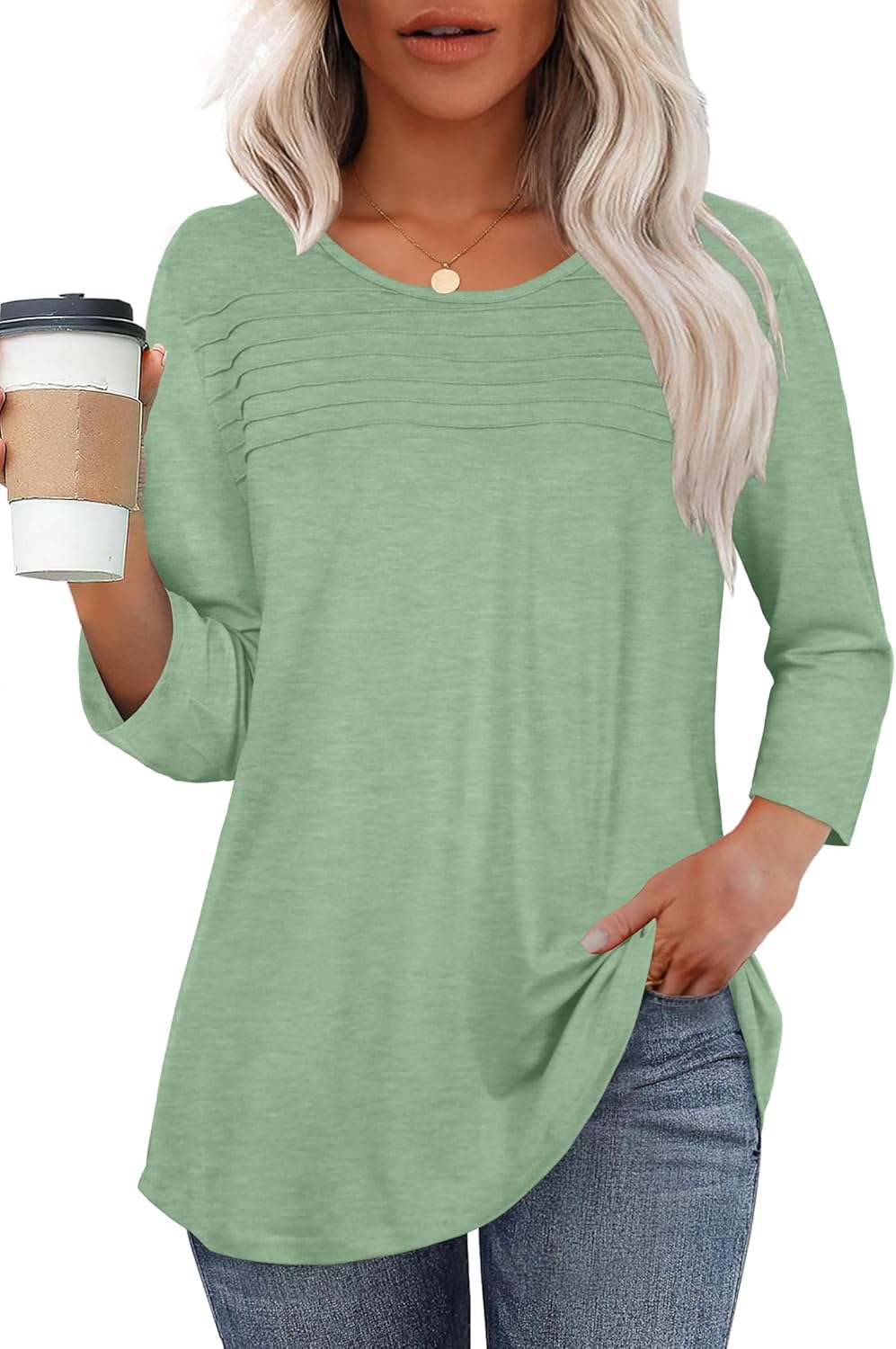 rosemia 3/4 Length Sleeve Womens Tops Crewneck Casual Tunic Dressy Pleated Front Loose Fit T Shirts