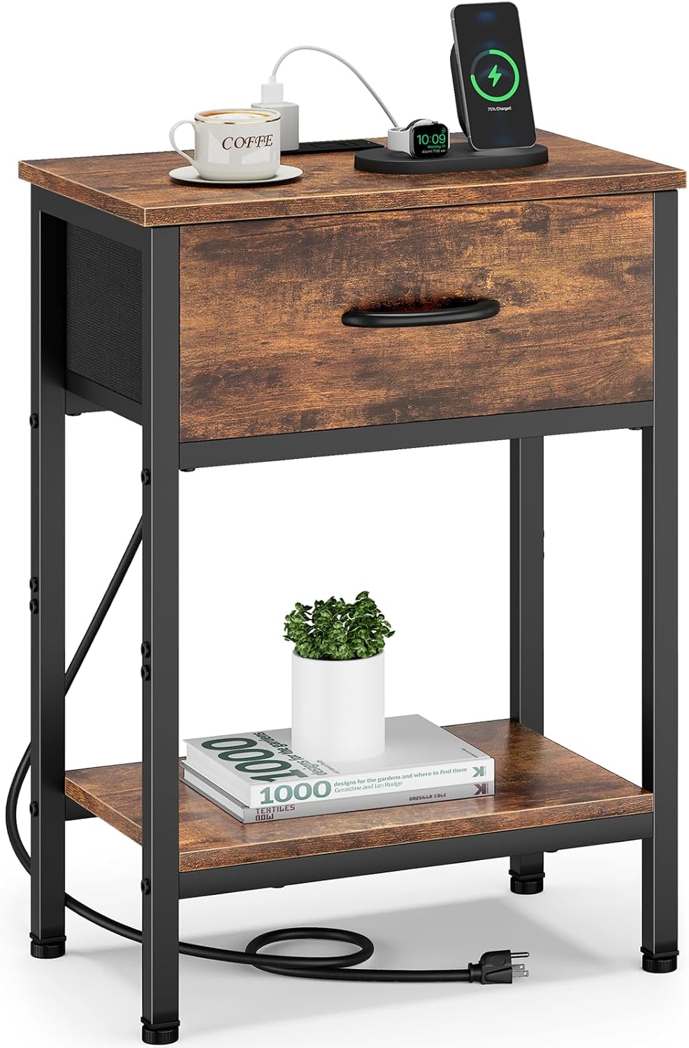 - 【Stable and Durable End Table】This bedside table with charging station is crafted from thickened steel, premium water-resistant wood board and non-woven fabric drawer, ensuring a long service time. Four adjustable feet pads can adapt to uneven ground, make it more stable and protecting the floor from scratches