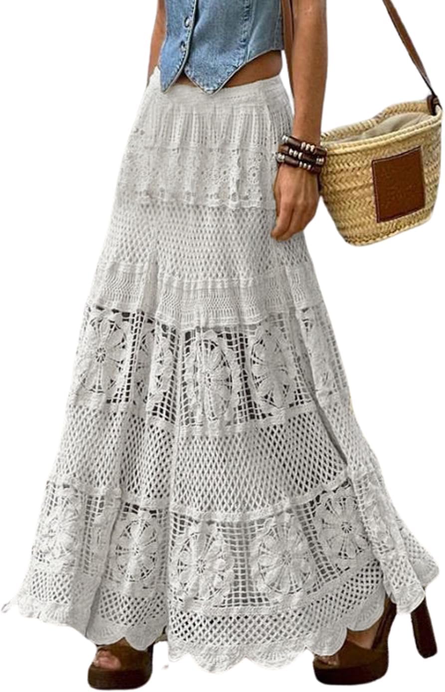 chouyatou Women's Western Floral Lace Crochet Knit Maxi Boho Skirt A-Line Eyelet Hippie Flowy Long Skirt