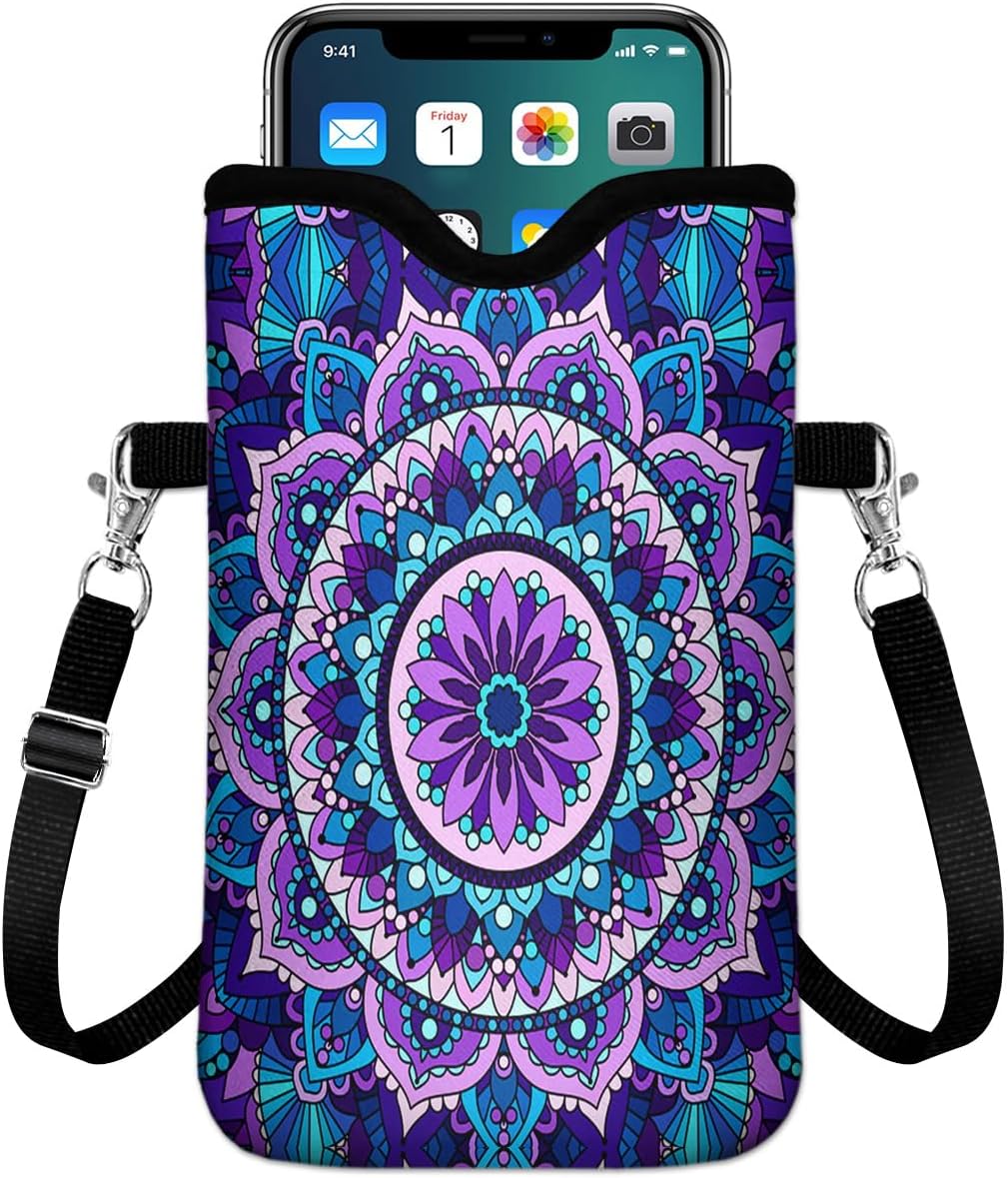 IRADA Neoprene Cell Phone Sleeve Pouch Case Bag with Crossbody Strap Neck Lanyard for Women Men 7.6 X 4.3 Inches-Purple Mandala Flower Shockproof Universal Phone Bag