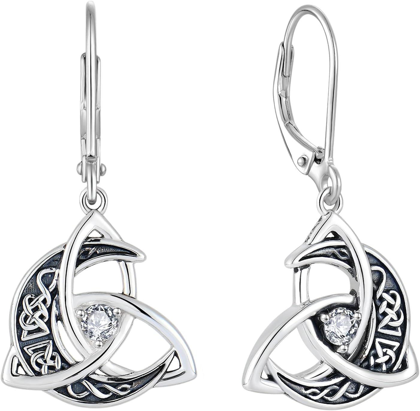 Trinity Celtic Knot Moon Leverback Earrings for Womens, 925 Sterling Silver Dangle Drop Round Gemstone Earrings, Irish Celtic Jewelry for Women