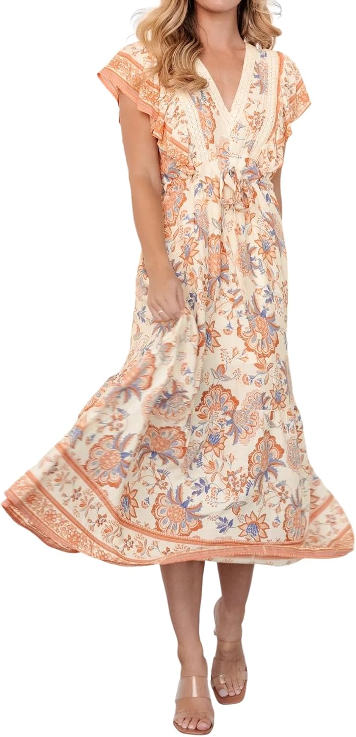 R.Vivimos Womens Summer 2026 Boho Floral Print V Neck Short Sleeve Drawstring Tie Casual Flowy Midi Dress